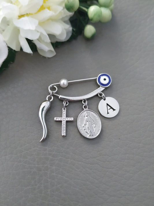 Silver Italian Horn Lucky Charm Safety Pin, Personalized Baby Pin