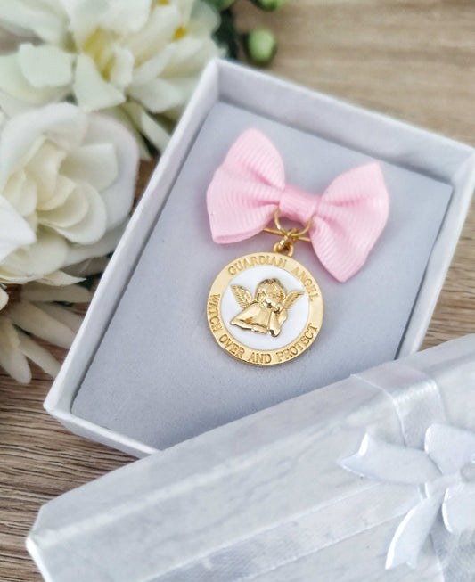 Guardian Angel Bowknot Safety Pin, Watch Over and Protect, Silver Baby Medallion, Christening Baptism Gift
