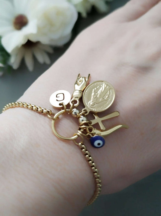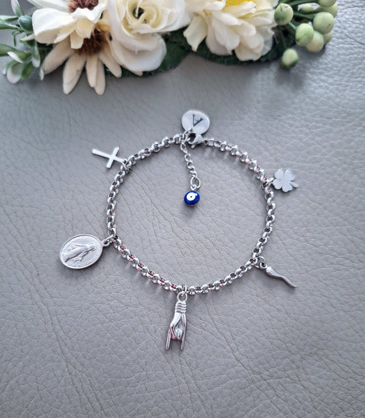 Dainty Italian Horn Bracelet with Cornicello, Cross, Clover Charms