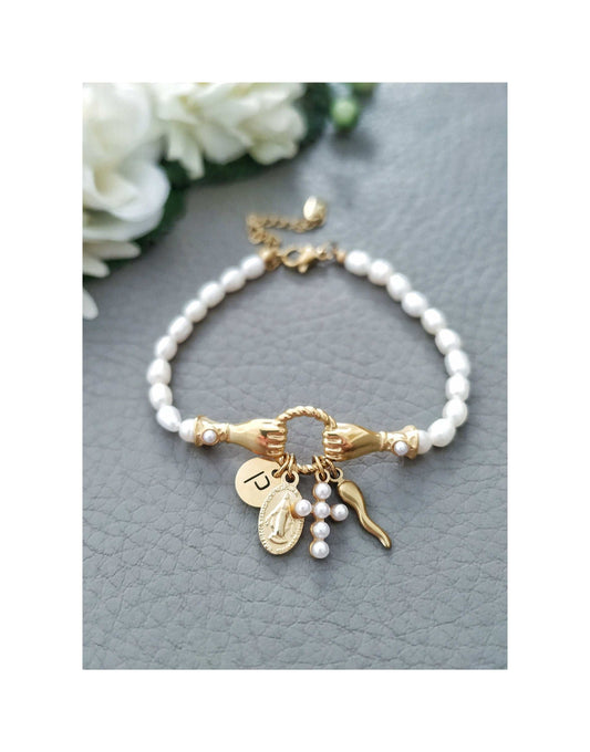 Regular price $46.00 USDRegular priceUnit price / perSale price $46.00 USDItalian Horn Charms Bracelet with Natural Pearls, Protection Jewelry