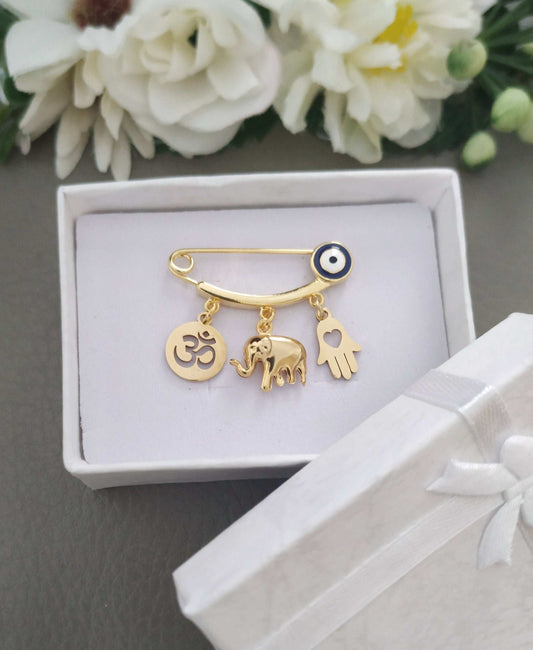 Good Luck Elephant Pin, Personalized Gold Ohm Hindu Brooch