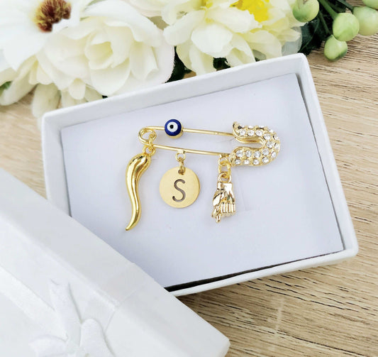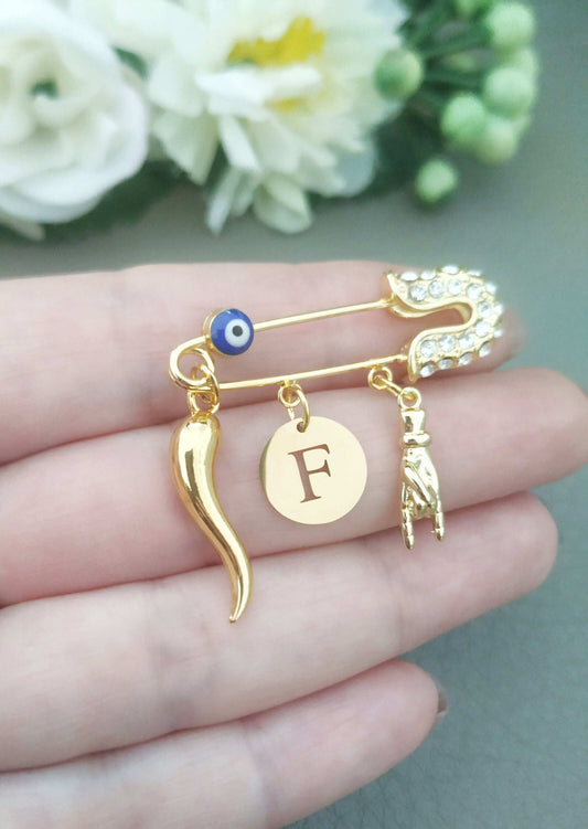 Italian Horn Brooch, Mano Corno Safety Pin, Personalized Cornicello Cornetti Mano Corna Portafortuna