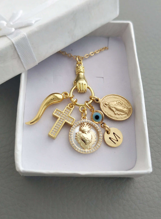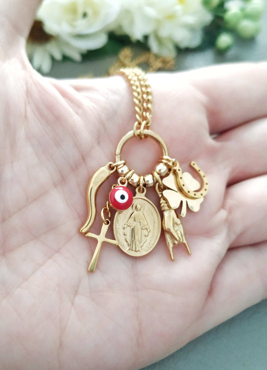 Italian Cornicello, Sacred Heart, Madonna Necklace