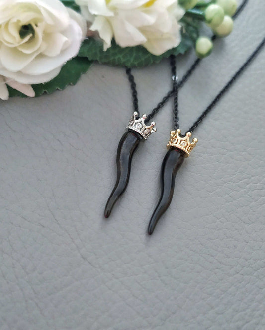 Italian Horn Black Cornicello with Crown Necklace, Good Luck Portafortuna Jewelry