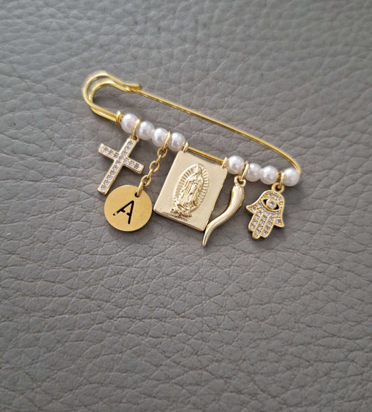 Guadalupe Safety Pin with Italian Horn, Cross, Blessed Mother Charms