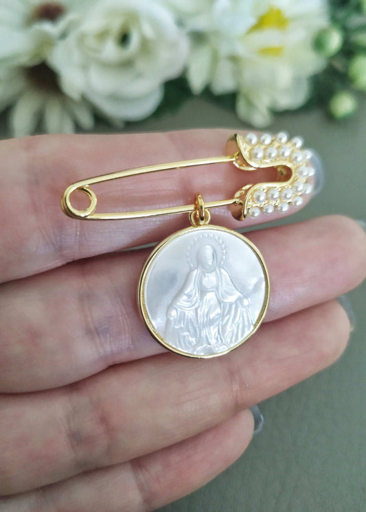 Fancy Baptism Brooch with Mother of Pearl Virgin Mary, Christening Gift for Boy or Girl