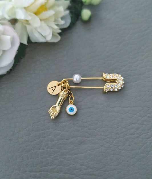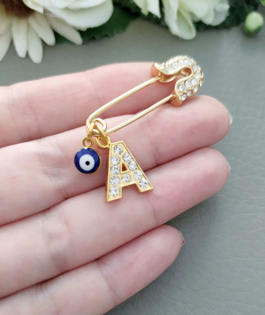 Personalized Evil Eye Pin, Gold Plated Paved Initial, Protection for Babies or Adults